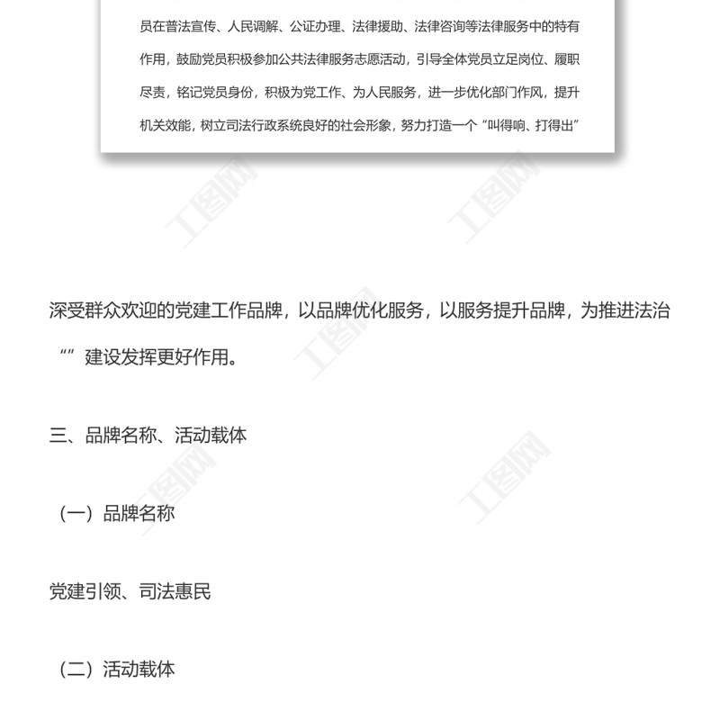 工圖網(wǎng)提供一支部一特色一品牌司法行政系統(tǒng)黨建活動創(chuàng)建方案供會員免費下載。更多精彩黨課PPT素材,盡在工圖網(wǎng)。