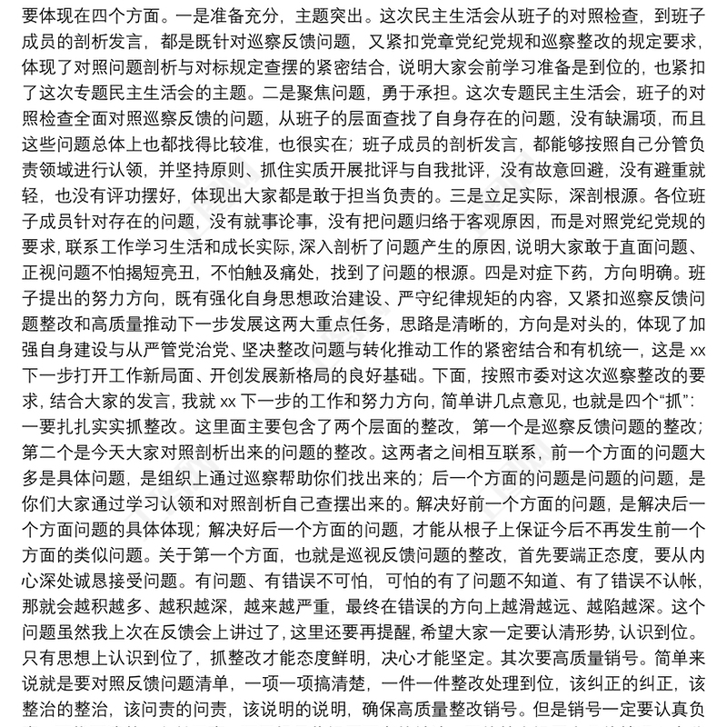 市委組織部長在縣委常委班子巡察整改專題民主生活會(huì)上的點(diǎn)評講話