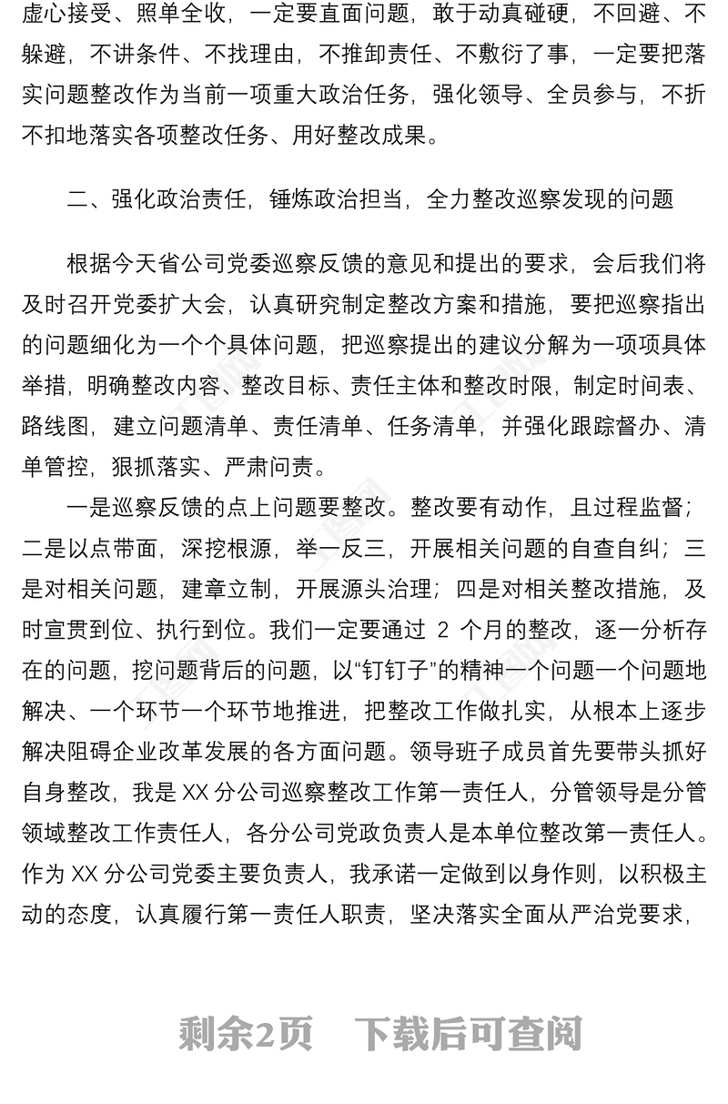 2021【表態(tài)發(fā)言】公司黨委書記在巡察反饋會(huì)上的表態(tài)發(fā)言