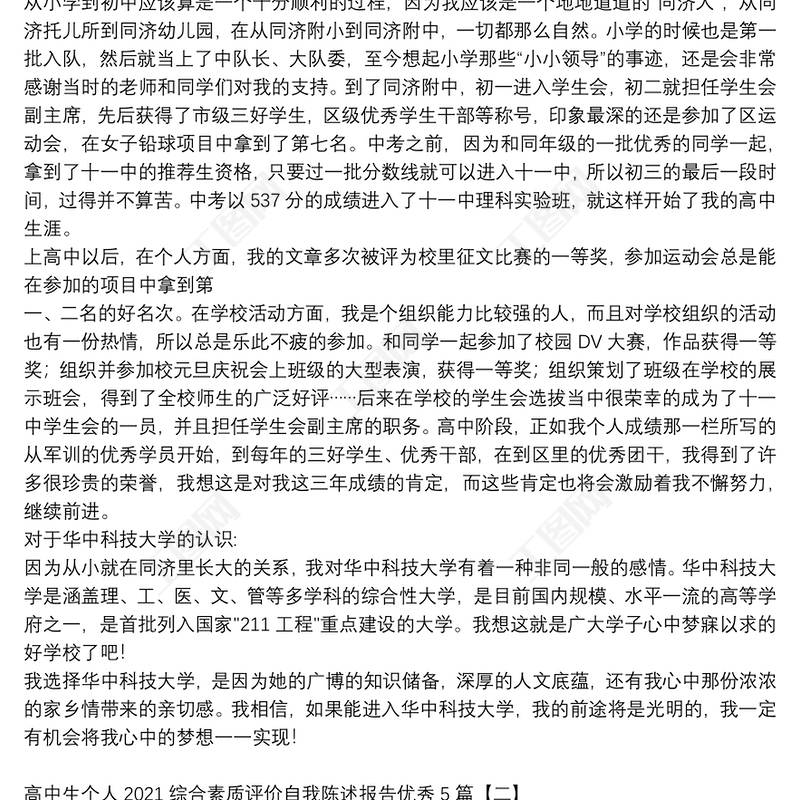 工圖網(wǎng)提供高中生個人2021綜合素質(zhì)評價自我陳述報告優(yōu)秀5篇供會員免費下載。更多精彩黨課PPT素材,盡在工圖網(wǎng)。