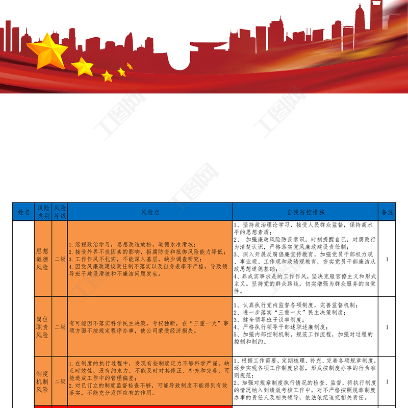 工圖網(wǎng)提供中層崗位廉政風(fēng)險(xiǎn)點(diǎn)匯總表供會(huì)員免費(fèi)下載。更多精彩黨課PPT素材,盡在工圖網(wǎng)。