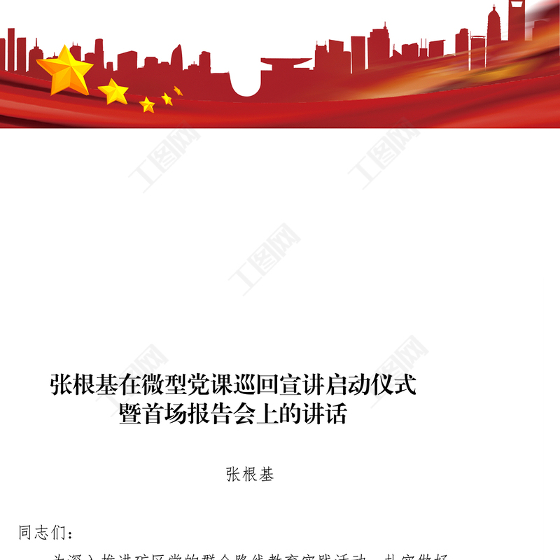 工圖網(wǎng)提供黨政材料:張根基在微型黨課巡回宣講啟動儀式暨首場報告會上的講話供會員免費下載。更多精彩黨課PPT素材,盡在工圖網(wǎng)。