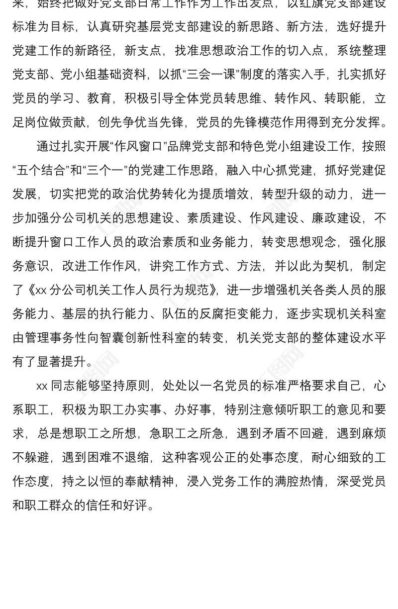 工圖網提供2021公司優(yōu)秀黨務工作者思想政治工作先進個人事跡材料供會員免費下載。更多精彩黨課PPT素材,盡在工圖網。