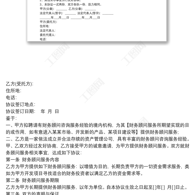 工圖網(wǎng)提供財務(wù)顧問服務(wù)合同標(biāo)準(zhǔn)版 3篇供會員免費下載。更多精彩黨課PPT素材,盡在工圖網(wǎng)。
