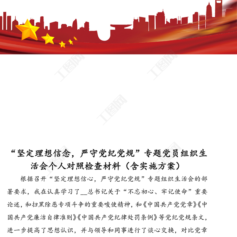 工圖網(wǎng)提供“堅(jiān)定理想信念,嚴(yán)守黨紀(jì)黨規(guī)”專題黨員組織生活會個人對照檢查材料(含實(shí)施方案)供會員免費(fèi)下載。更多精彩黨課PPT素材,盡在工圖網(wǎng)。