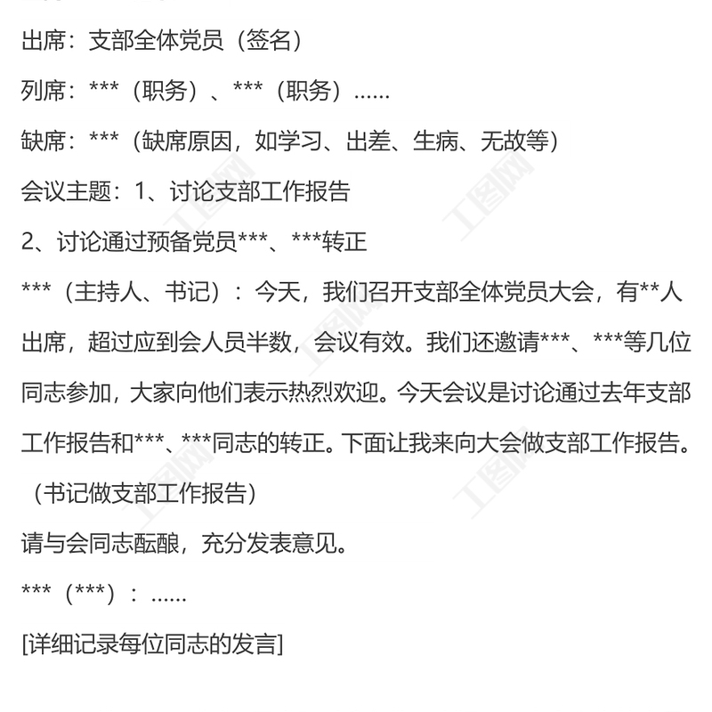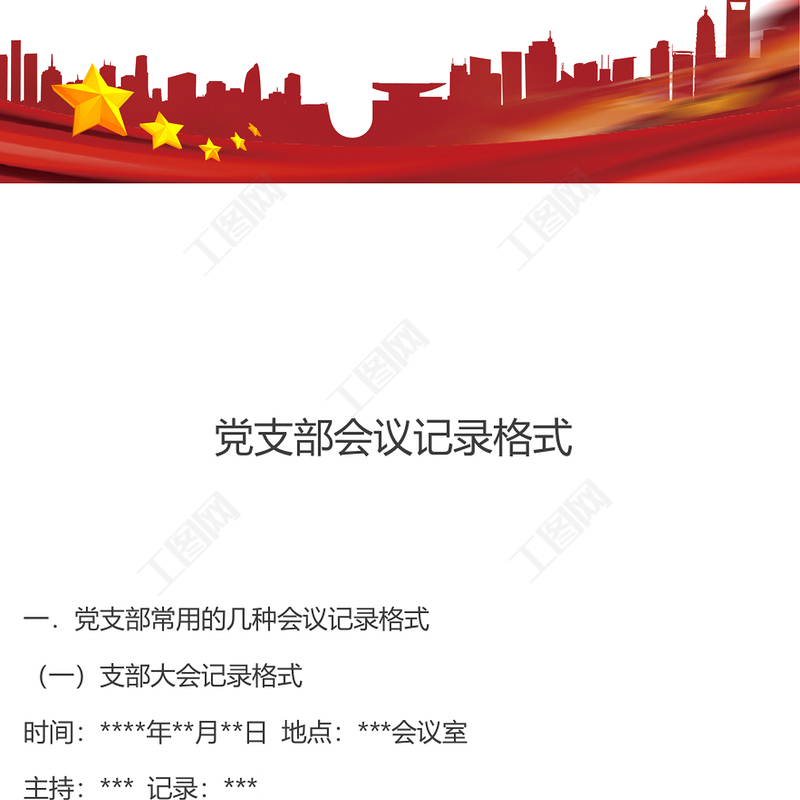 工圖網(wǎng)提供黨支部會(huì)議記錄格式供會(huì)員免費(fèi)下載。更多精彩黨課PPT素材,盡在工圖網(wǎng)。