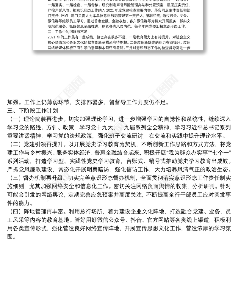 工圖網(wǎng)提供銀行2021年意識(shí)形態(tài)工作總結(jié)供會(huì)員免費(fèi)下載。更多精彩黨課PPT素材,盡在工圖網(wǎng)。