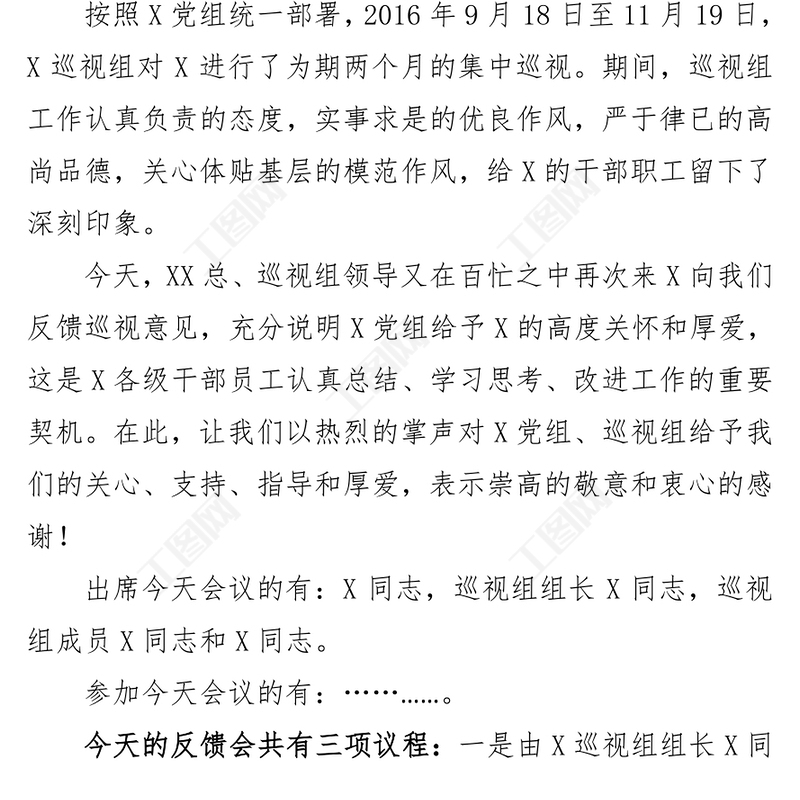 工圖網(wǎng)提供在X巡視情況反饋會(huì)上的主持詞暨表態(tài)發(fā)言供會(huì)員免費(fèi)下載。更多精彩黨課PPT素材,盡在工圖網(wǎng)。