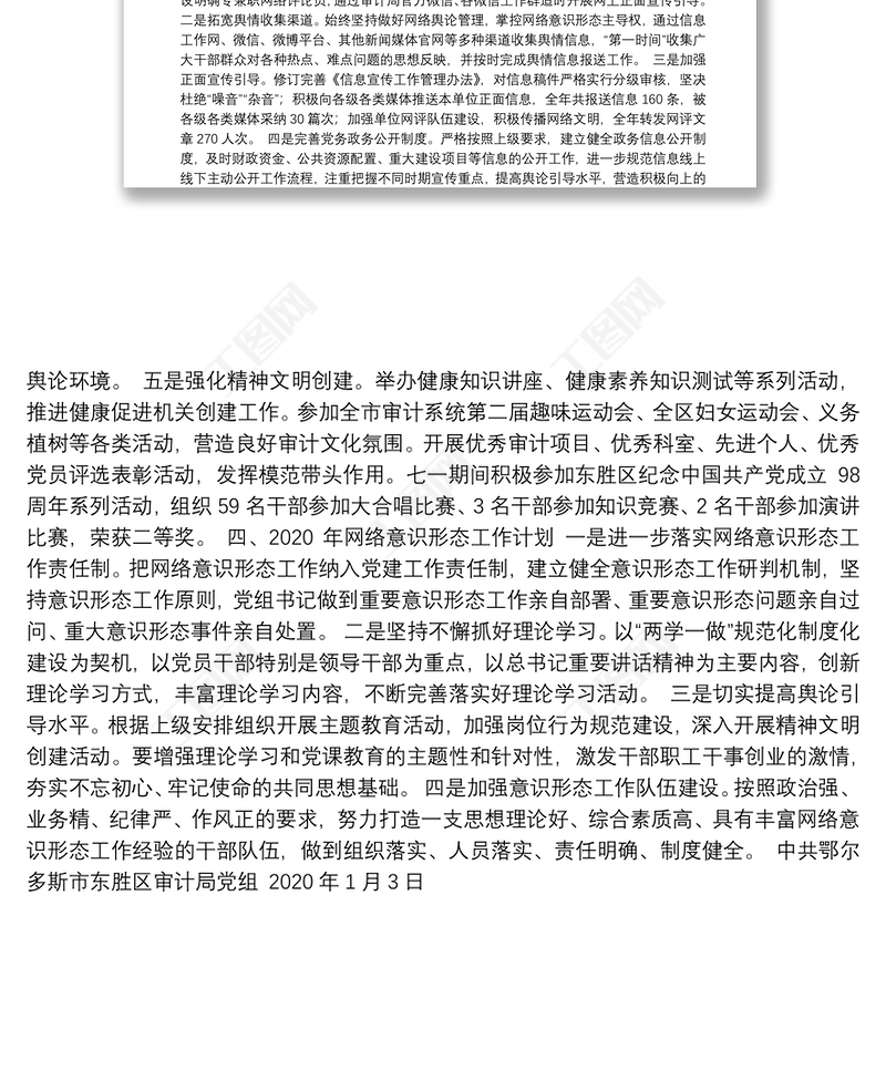中共鄂爾多斯市東勝區(qū)審計局黨組關(guān)于報送審計局2019年網(wǎng)絡(luò)意識形態(tài)工作總結(jié)和2020年網(wǎng)絡(luò)意識形態(tài)工作計劃的報告包含