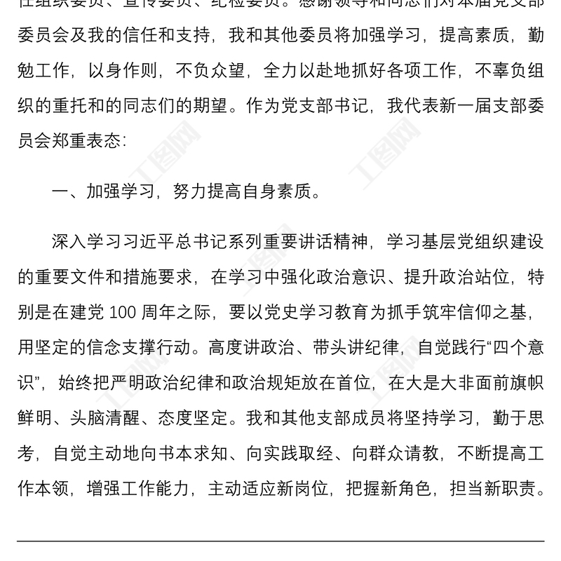 工圖網(wǎng)提供20215篇最新新當(dāng)選機(jī)關(guān)黨支部書(shū)記代表新一屆支部委員會(huì)任職表態(tài)發(fā)言供會(huì)員免費(fèi)下載。更多精彩黨課PPT素材,盡在工圖網(wǎng)。