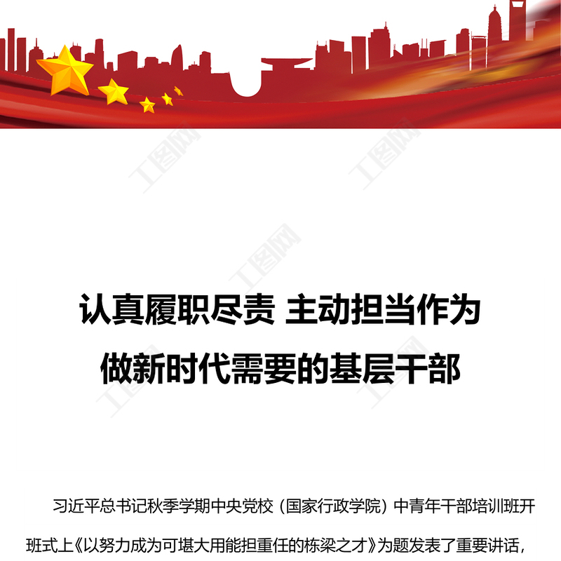 工圖網(wǎng)提供做新時代履職盡責(zé)好干部PPT大氣簡潔履職盡責(zé)擔(dān)當(dāng)作為基層干部教育培訓(xùn)黨課下載(講稿)供會員免費(fèi)下載。更多精彩黨課PPT素材,盡在工圖網(wǎng)。