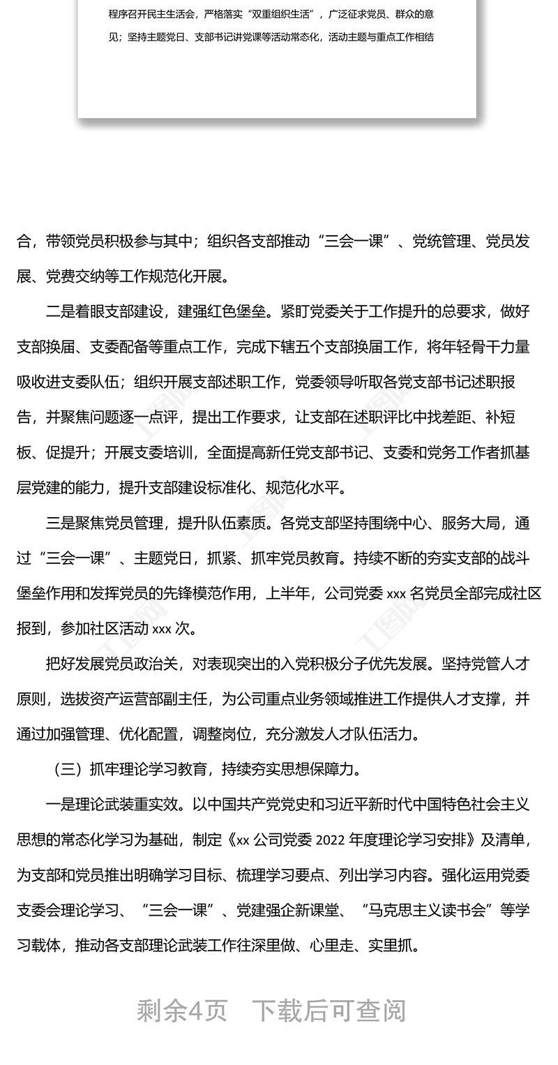 工圖網(wǎng)提供2022年上半年全面從嚴治黨(黨建)工作總結(集團公司)供會員免費下載。更多精彩黨課PPT素材,盡在工圖網(wǎng)。