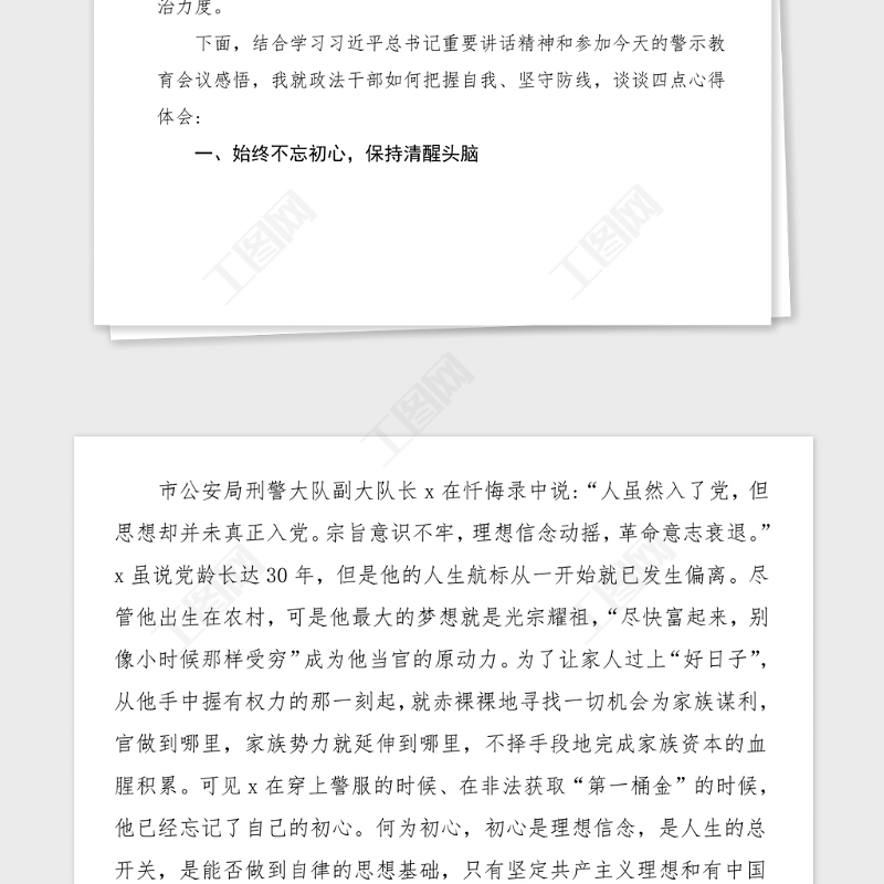工圖網(wǎng)提供警示教育心得政法系統(tǒng)警示教育大會心得體會范文政法干部警示教育片觀后感研討發(fā)言材料政法隊伍教育整頓參考素材供會員免費(fèi)下載。更多精彩黨課PPT素材,盡在工圖網(wǎng)。