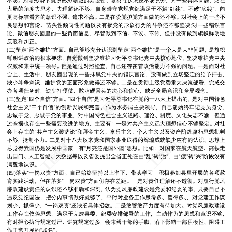 “防風(fēng)險(xiǎn)、守底線”專題民主生活會組織生活會個對照檢查剖析材料包含