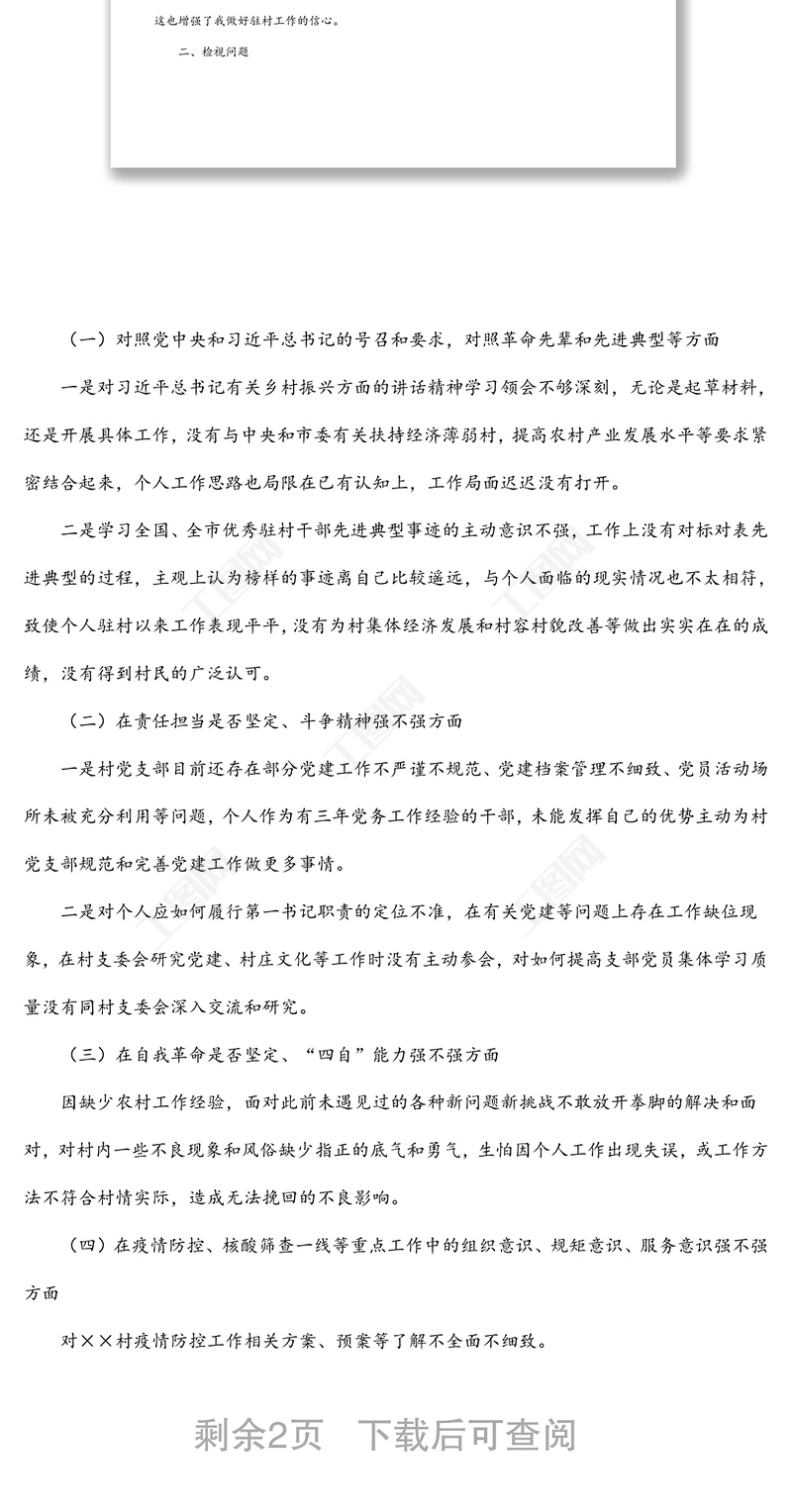駐村干部2021年度組織生活會個人對照檢查材料,駐村干部2021年度組織生活會個人對照檢查材料 Array