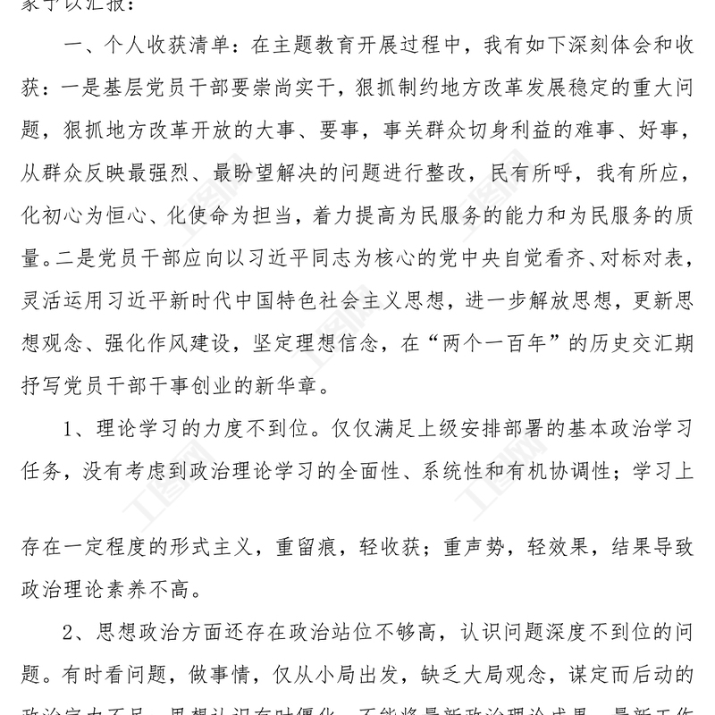 工圖網(wǎng)提供在主題教育專題民主生活會上的個人收獲檢視問題清單以及整改措施匯報供會員免費下載。更多精彩黨課PPT素材,盡在工圖網(wǎng)。