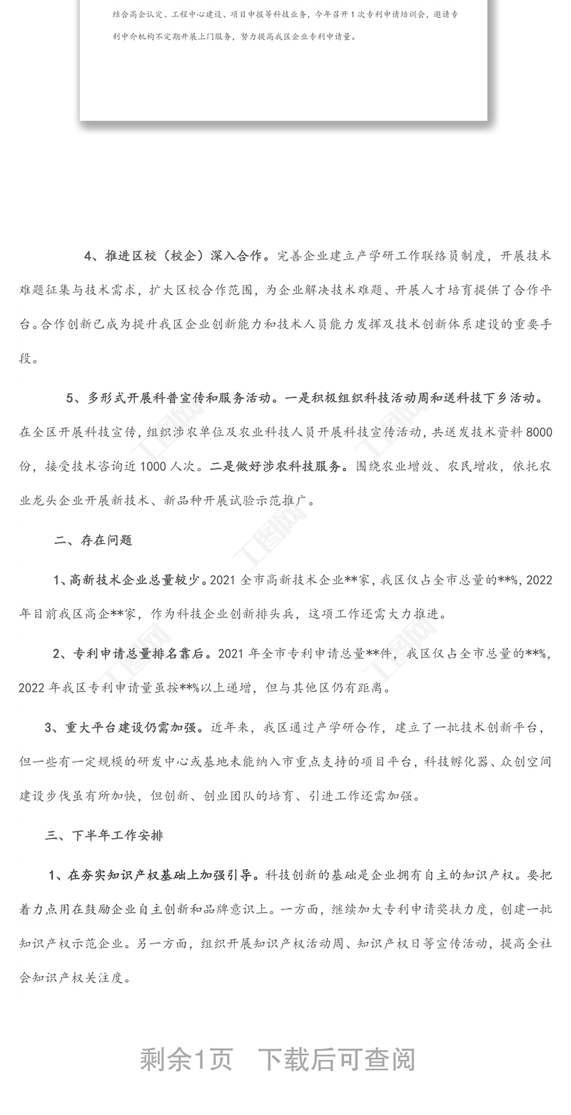 工圖網(wǎng)提供區(qū)科技創(chuàng)新上半年工作總結(jié)及下半年工作安排供會員免費下載。更多精彩黨課PPT素材,盡在工圖網(wǎng)。