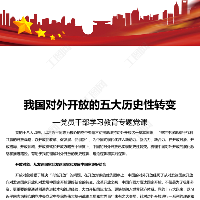 工圖網(wǎng)提供我國對外開放的五大歷史性轉(zhuǎn)變PPT紅色簡潔學(xué)習(xí)教育專題黨課課件(講稿)供會(huì)員免費(fèi)下載。更多精彩黨課PPT素材,盡在工圖網(wǎng)。