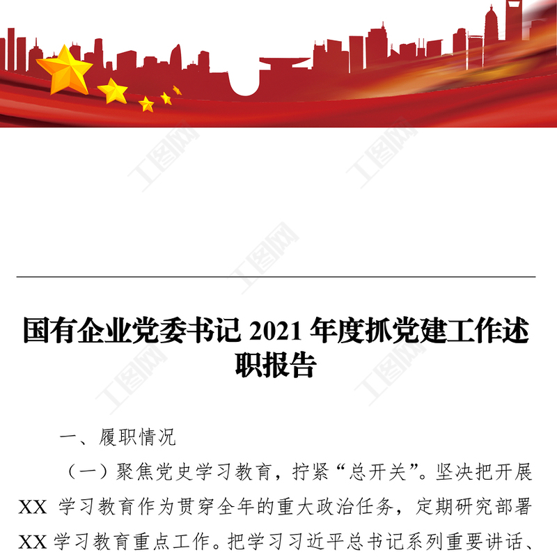 工圖網(wǎng)提供國有企業(yè)黨委書記2021年度抓黨建工作述職報告供會員免費下載。更多精彩黨課PPT素材,盡在工圖網(wǎng)。