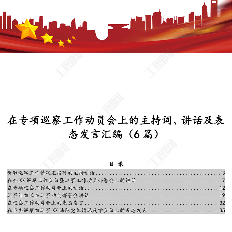 工圖網(wǎng)提供在專項巡察工作動員會上的主持詞、講話及表態(tài)發(fā)言匯編(6篇)供會員免費下載。更多精彩黨課PPT素材,盡在工圖網(wǎng)。