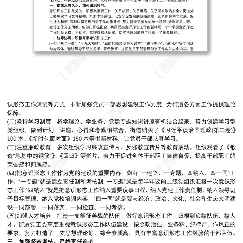 2021年意識形態(tài)工作學(xué)習(xí)材料2021黨支部書記意識形態(tài)工作述職報(bào)告專題研究意識形態(tài)工作會議記錄2021意識形態(tài)工作組織生活會材料2022融媒體中心意識形態(tài)工作總結(jié)2022意識形態(tài)工作巡察重點(diǎn)及注意事項(xiàng)公安意識形態(tài)工作計(jì)劃2021中學(xué)2021年意識形態(tài)工作總結(jié)退役軍人事務(wù)局2022年意識形態(tài)工作計(jì)劃2022黨風(fēng)廉政建設(shè)及意識形態(tài)工作情況匯報(bào)2021車隊(duì)意識形態(tài)工作總結(jié)編辦意識形態(tài)工作整改2022醫(yī)院黨建意識形態(tài)工作計(jì)劃社區(qū)2021年上半年意識形態(tài)工作總結(jié)2022意識形態(tài)工作一會一報(bào)制度文件消防大隊(duì)2021年意識形態(tài)工作總結(jié)