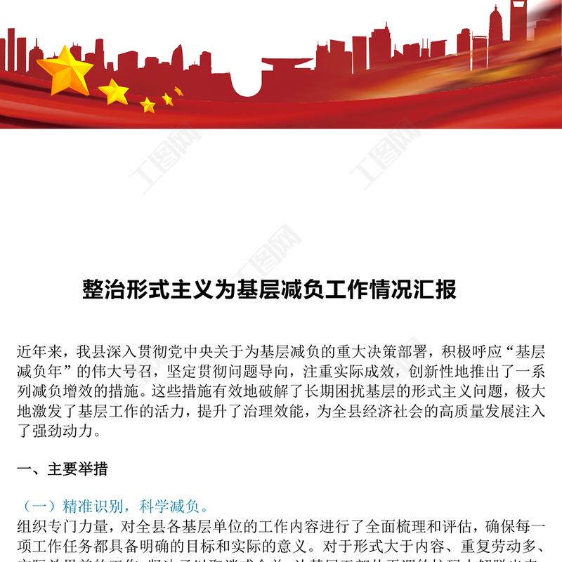工圖網(wǎng)提供整治形式主義為基層減負(fù)工作情況匯報(bào)范文供會(huì)員免費(fèi)下載。更多精彩黨課PPT素材,盡在工圖網(wǎng)。