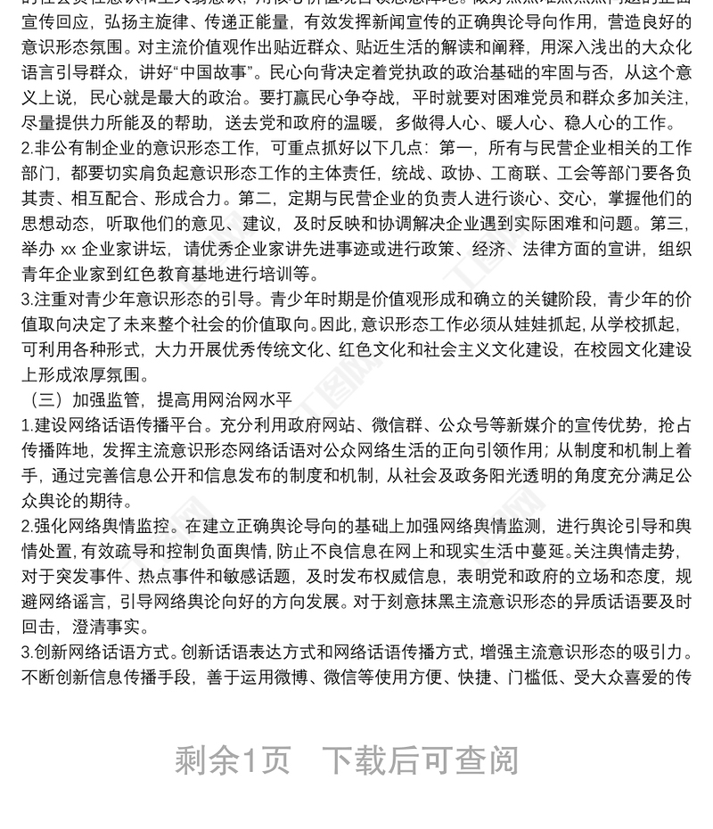 2021年意識(shí)形態(tài)工作學(xué)習(xí)材料2021黨支部書記意識(shí)形態(tài)工作述職報(bào)告意識(shí)形態(tài)工作調(diào)研報(bào)告2022年2022黨員領(lǐng)導(dǎo)干部網(wǎng)絡(luò)意識(shí)形態(tài)工作教育培訓(xùn)工作方案2021黨委黨組網(wǎng)絡(luò)意識(shí)形態(tài)工作責(zé)任實(shí)施細(xì)則全文專題研究意識(shí)形態(tài)工作會(huì)議記錄2021意識(shí)形態(tài)工作組織生活會(huì)材料2021網(wǎng)絡(luò)意識(shí)形態(tài)工作分析研判報(bào)告2022意識(shí)形態(tài)工作巡察重點(diǎn)及注意事項(xiàng)公安意識(shí)形態(tài)工作計(jì)劃2021統(tǒng)戰(zhàn)部工作意識(shí)形態(tài)發(fā)言中學(xué)2021年意識(shí)形態(tài)工作總結(jié)2022公司關(guān)于推進(jìn)基層黨建三基本建設(shè)與三基工作有機(jī)融合的實(shí)施方案2021車隊(duì)意識(shí)形態(tài)工作總結(jié)編辦意識(shí)形態(tài)工作整改社區(qū)2021年上半年意識(shí)形態(tài)工作總結(jié)