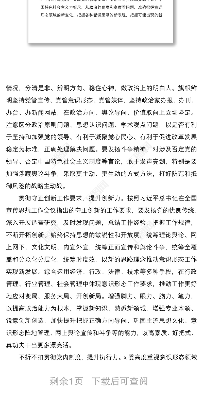 2021年意識(shí)形態(tài)工作學(xué)習(xí)材料2022關(guān)于意識(shí)形態(tài)工作的重要論述發(fā)言稿2021黨支部書記意識(shí)形態(tài)工作述職報(bào)告2022黨員領(lǐng)導(dǎo)干部網(wǎng)絡(luò)意識(shí)形態(tài)工作教育培訓(xùn)工作方案2021黨委黨組網(wǎng)絡(luò)意識(shí)形態(tài)工作責(zé)任實(shí)施細(xì)則全文2021意識(shí)形態(tài)工作組織生活會(huì)材料2021網(wǎng)絡(luò)意識(shí)形態(tài)工作分析研判報(bào)告2022年意識(shí)形態(tài)個(gè)人研討發(fā)言材料公安意識(shí)形態(tài)工作計(jì)劃2021統(tǒng)戰(zhàn)部工作意識(shí)形態(tài)發(fā)言中學(xué)2021年意識(shí)形態(tài)工作總結(jié)2021意識(shí)形態(tài)網(wǎng)絡(luò)輿情管控工作總結(jié)2021意識(shí)形態(tài)工作組織生活會(huì)對照檢查材料2021意識(shí)形態(tài)工作專題研究學(xué)習(xí)材料社區(qū)2021年上半年意識(shí)形態(tài)工作總結(jié)