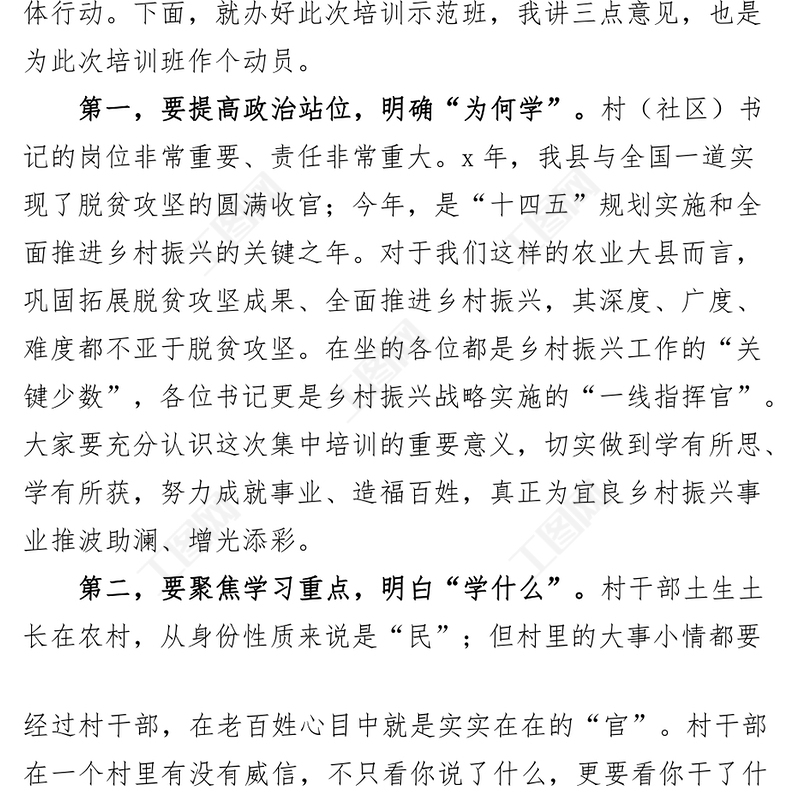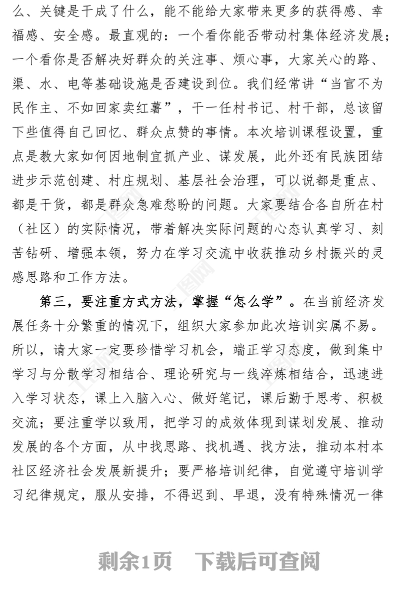 村社區(qū)黨組織書記暨農村基層干部鄉(xiāng)村振興培訓示范班開班儀式動員講話