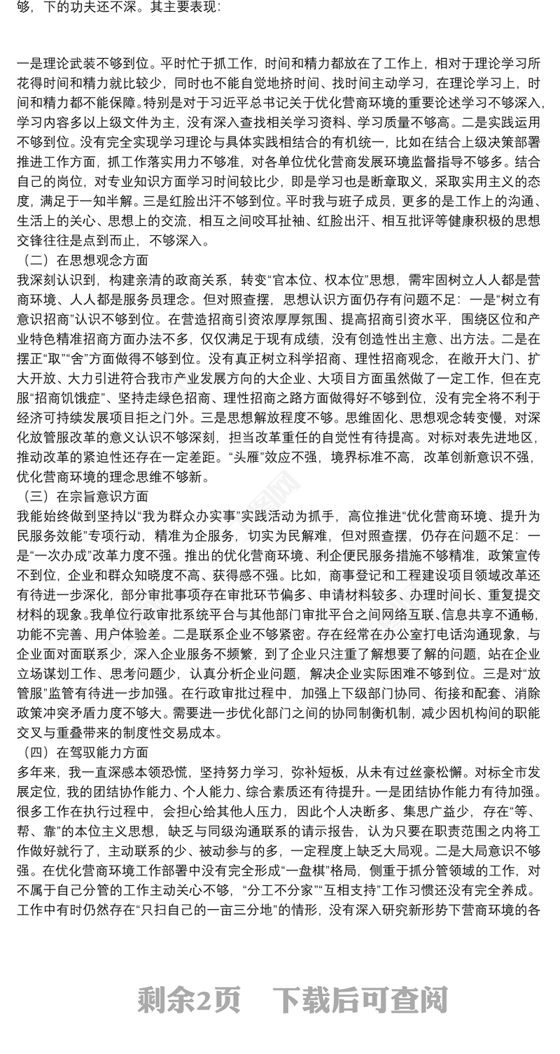 領(lǐng)導干部優(yōu)化營商環(huán)境民主生活會個人對照檢查材料