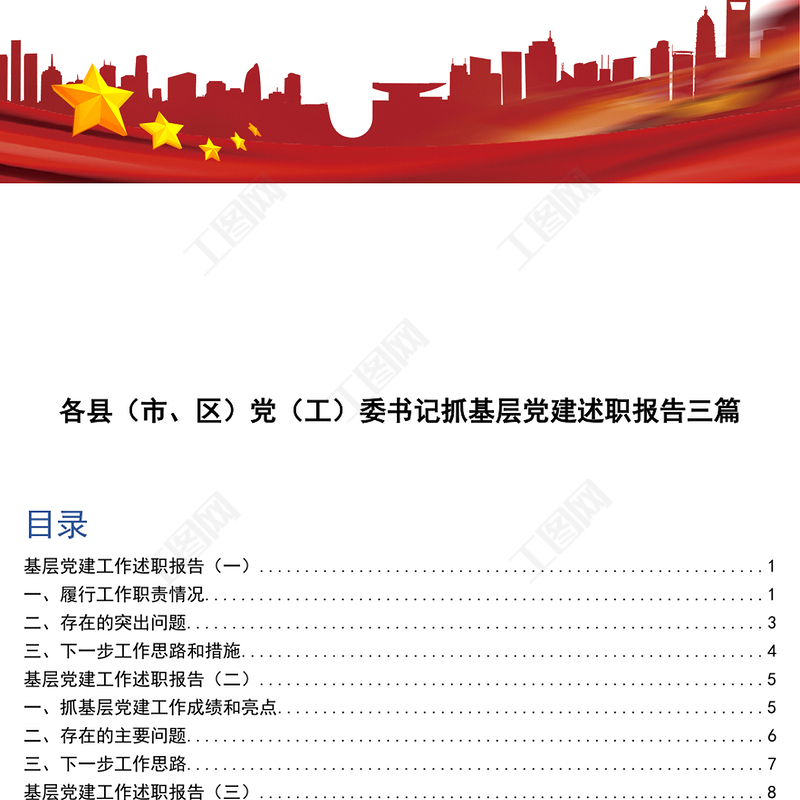 工圖網提供各縣(市、區(qū))黨(工)委書記抓基層黨建述職報告三篇供會員免費下載。更多精彩黨課PPT素材,盡在工圖網。