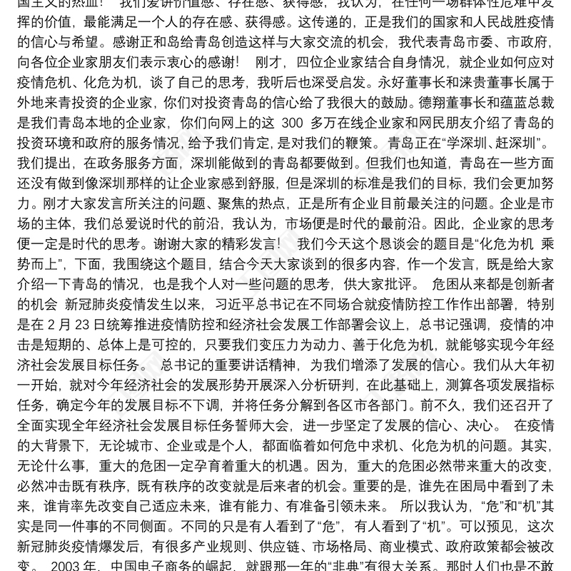 在“化危為機 乘勢而上·青島與企業(yè)共發(fā)展”線上懇談會上的講話