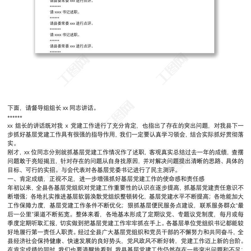 工圖網(wǎng)提供在基層黨組織書記抓黨建工作述職評議會的主持詞及講話提綱供會員免費下載。更多精彩黨課PPT素材,盡在工圖網(wǎng)。