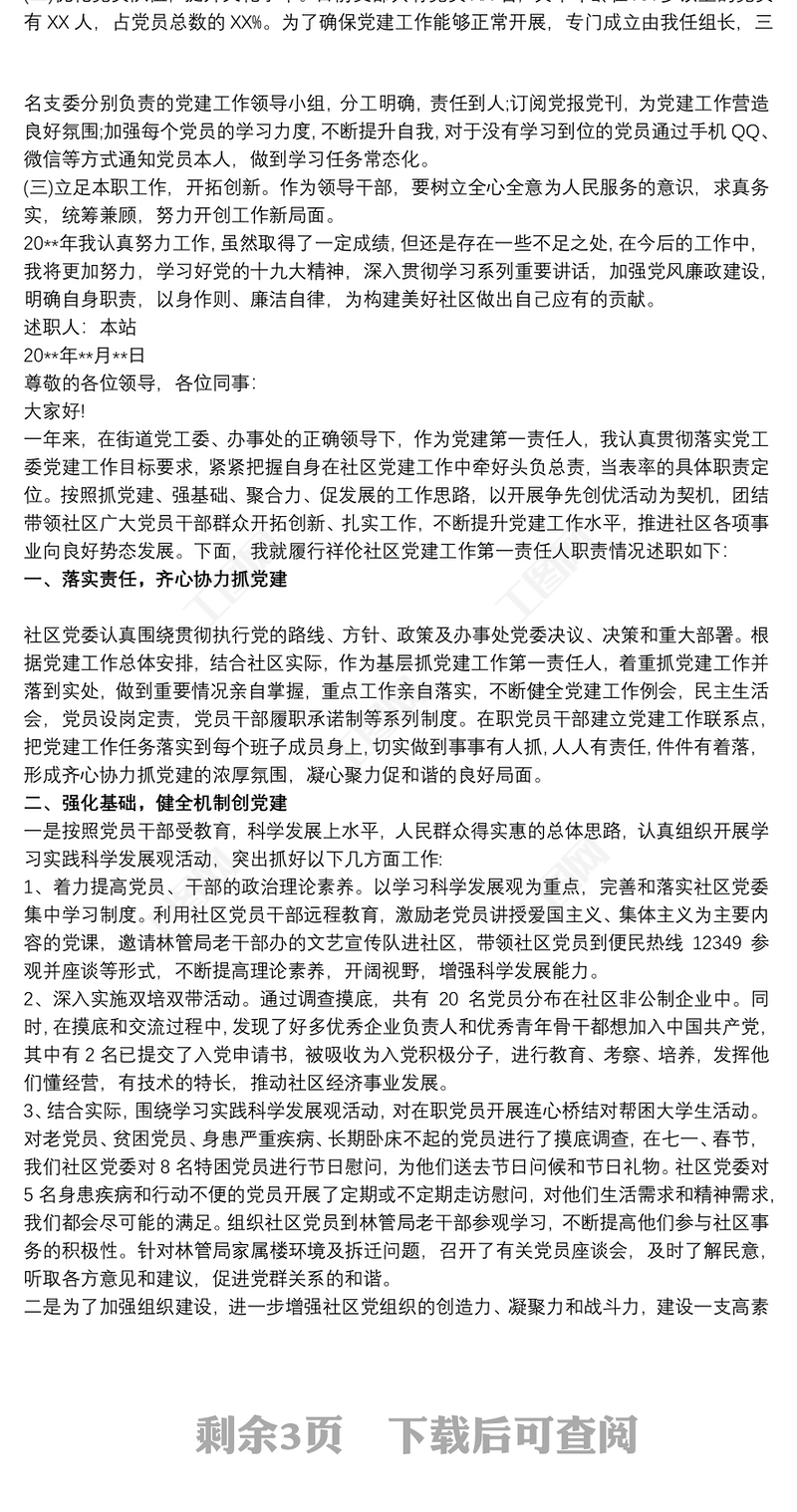 工圖網(wǎng)提供20xx年XX社區(qū)黨委書記黨建述職報(bào)告(完整通用版)供會(huì)員免費(fèi)下載。更多精彩黨課PPT素材,盡在工圖網(wǎng)。