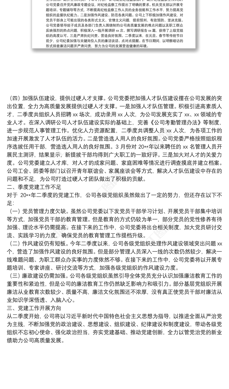 20**年二季度企業(yè)黨建工作總結(jié)報告