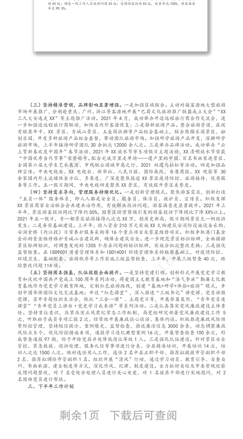 X市景區(qū)管理局2021年上半年工作總結(jié)及下半年工作計劃,工作總結(jié),公文范文 Array