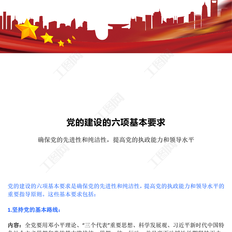 工圖網(wǎng)提供黨的建設(shè)的六項(xiàng)基本要求PPT黨員干部思想教育黨課(講稿)供會(huì)員免費(fèi)下載。更多精彩黨課PPT素材,盡在工圖網(wǎng)。