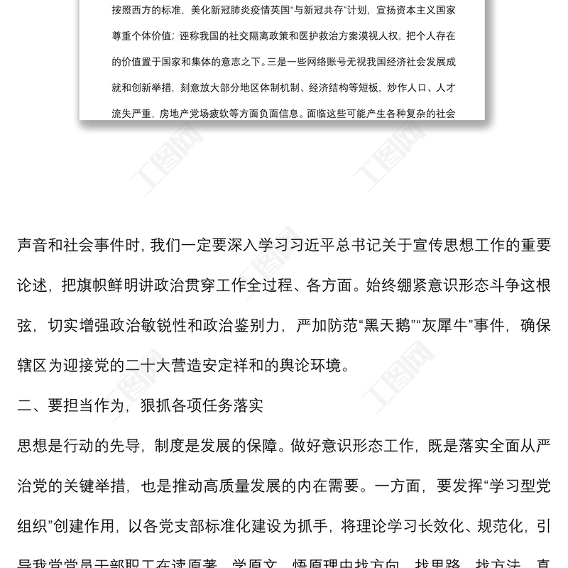 > 領(lǐng)導(dǎo)講話 > 意識形態(tài)工作專題研究會講話:認(rèn)清形勢 擔(dān)當(dāng)作為 筑牢轄區(qū)意識形態(tài)安全防線.DOCX 【圖片、文字、動畫均可編輯】