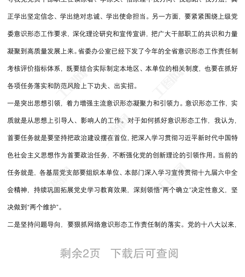 2021年意識形態(tài)工作學(xué)習(xí)材料2021黨支部書記意識形態(tài)工作述職報告2022黨員領(lǐng)導(dǎo)干部網(wǎng)絡(luò)意識形態(tài)工作教育培訓(xùn)工作方案2022意識形態(tài)工作會議領(lǐng)導(dǎo)講話2021黨委黨組網(wǎng)絡(luò)意識形態(tài)工作責(zé)任實施細(xì)則全文2021意識形態(tài)工作組織生活會材料2021網(wǎng)絡(luò)意識形態(tài)工作分析研判報告2022意識形態(tài)工作巡察重點及注意事項公安意識形態(tài)工作計劃2021統(tǒng)戰(zhàn)部工作意識形態(tài)發(fā)言中學(xué)2021年意識形態(tài)工作總結(jié)2021車隊意識形態(tài)工作總結(jié)2021意識形態(tài)工作專題研究學(xué)習(xí)材料編辦意識形態(tài)工作整改社區(qū)2021年上半年意識形態(tài)工作總結(jié)
