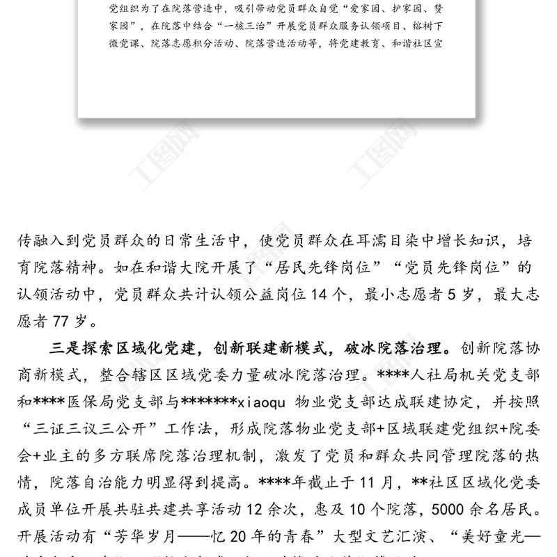 工圖網(wǎng)提供社區(qū)特色亮點(diǎn)工作全年工作總結(jié)供會(huì)員免費(fèi)下載。更多精彩黨課PPT素材,盡在工圖網(wǎng)。