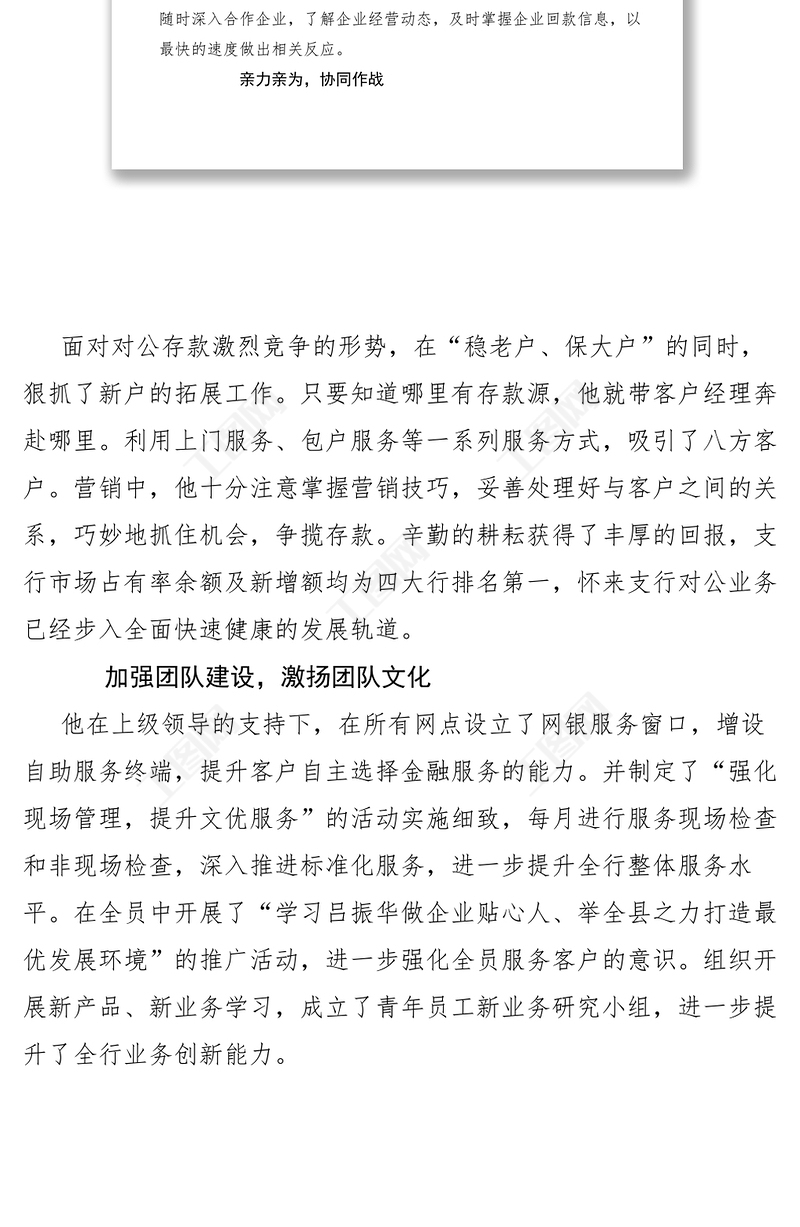首頁 > WORD文檔 > 公文范文 > 2021銀行副行長xx年度企業(yè)服務(wù)標(biāo)兵推薦材料.DOCX 【圖片、文字、動畫均可編輯】