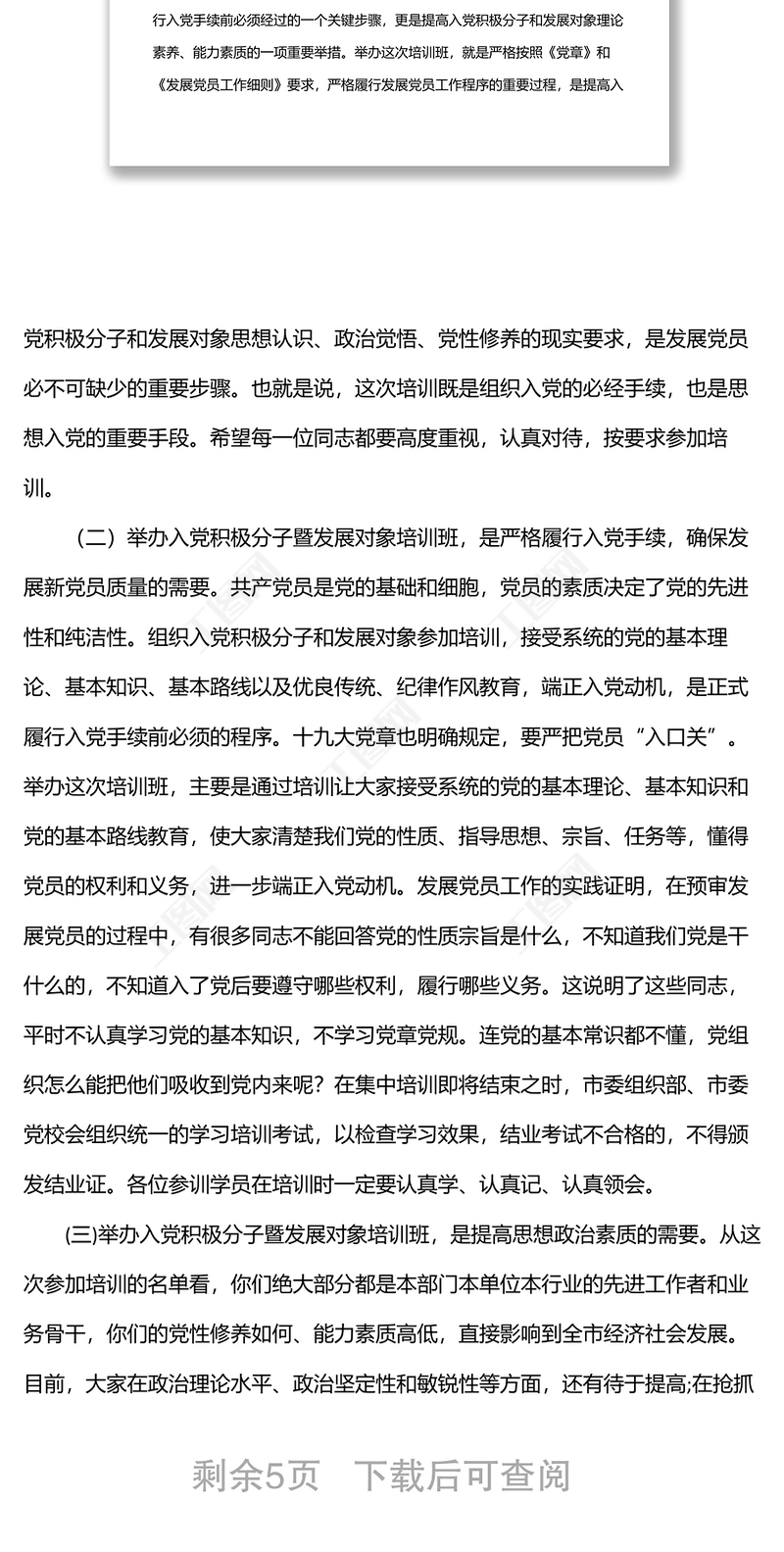 在市直機關、企事業(yè)單位入黨積極分子暨發(fā)展對象培訓班開班儀式上的講話