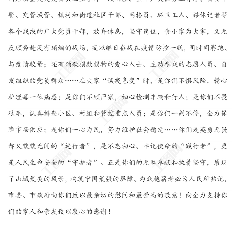 致全市疫情防控一線全體工作人員的一封信,疫情防控感謝信,疫情防控感謝信,公文范例,領(lǐng)導(dǎo)述職報(bào)告,機(jī)關(guān)公文寫作 Array