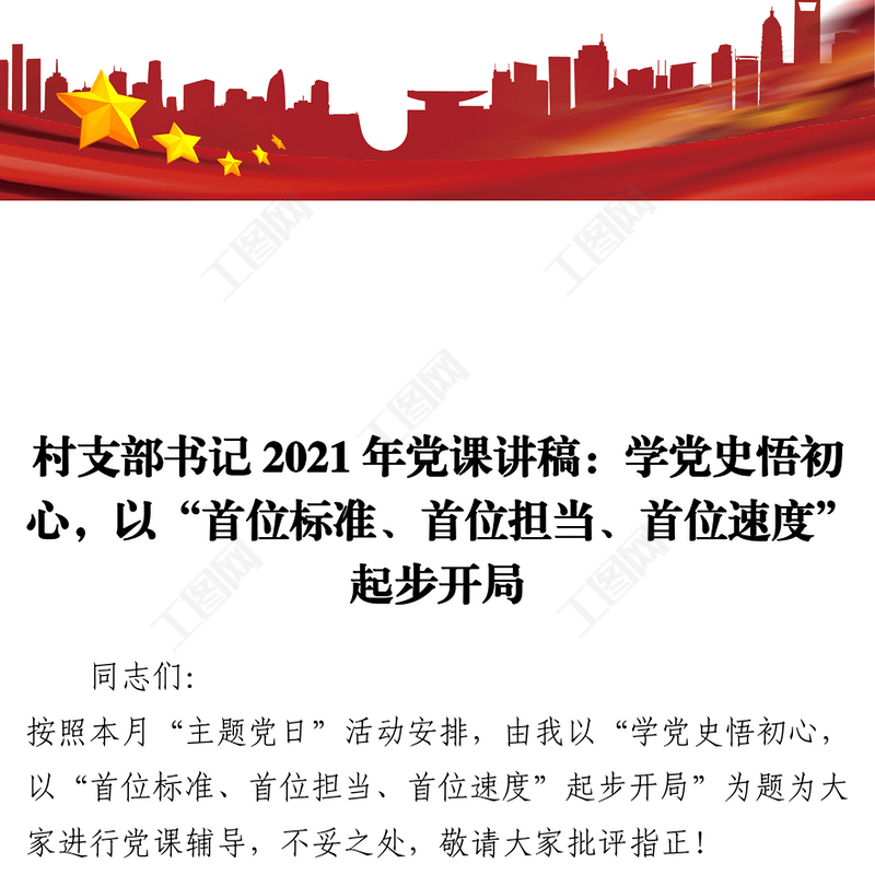 工圖網(wǎng)提供村支部書記2021年黨課講稿:學(xué)黨史悟初心,以“首位標準、首位擔當、首位速度”起步開局供會員免費下載。更多精彩黨課PPT素材,盡在工圖網(wǎng)。