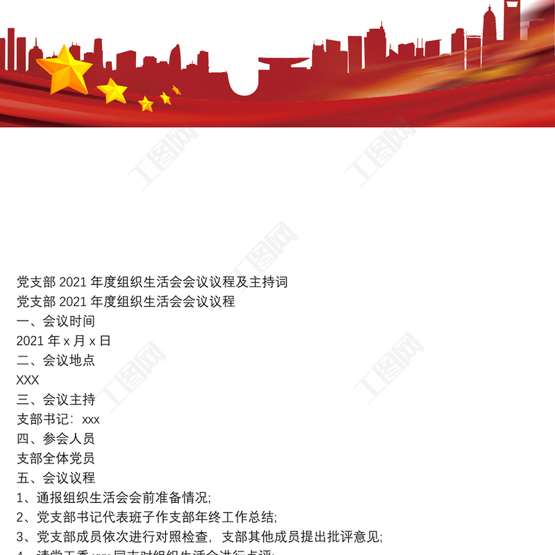 工圖網提供黨支部2021年度組織生活會會議議程及主持詞供會員免費下載。更多精彩黨課PPT素材,盡在工圖網。