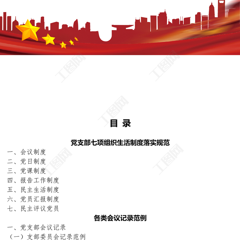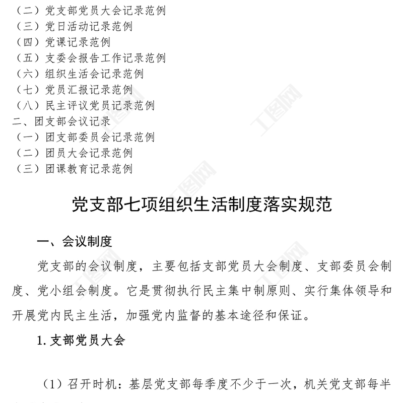 工圖網(wǎng)提供2021黨支部7項(xiàng)組織生活制度落實(shí)規(guī)范及黨團(tuán)各類會(huì)議記錄范例供會(huì)員免費(fèi)下載。更多精彩黨課PPT素材,盡在工圖網(wǎng)。