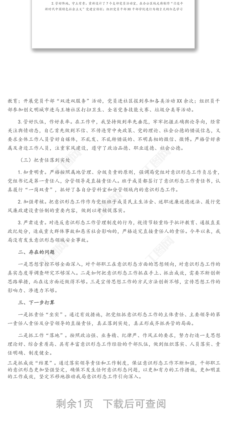 2022意識(shí)形態(tài)工作研判報(bào)告2021黨支部書記意識(shí)形態(tài)工作述職報(bào)告意識(shí)形態(tài)工作調(diào)研報(bào)告2022年2022黨員領(lǐng)導(dǎo)干部網(wǎng)絡(luò)意識(shí)形態(tài)工作教育培訓(xùn)工作方案2021意識(shí)形態(tài)工作組織生活會(huì)材料2021網(wǎng)絡(luò)意識(shí)形態(tài)工作分析研判報(bào)告2021黨組書記全面從嚴(yán)治黨第一責(zé)任人責(zé)任清單2022黨支部年度意識(shí)形態(tài)工作報(bào)告2022意識(shí)形態(tài)工作巡察重點(diǎn)及注意事項(xiàng)2022黨風(fēng)廉政建設(shè)及意識(shí)形態(tài)工作情況匯報(bào)2022年黨組書記落實(shí)全面從嚴(yán)治黨第一責(zé)任人責(zé)任清單2022老干部意識(shí)形態(tài)工作風(fēng)險(xiǎn)點(diǎn)排查報(bào)告2022關(guān)于審議意識(shí)形態(tài)工作報(bào)告的請(qǐng)示2023銀行意識(shí)形態(tài)工作研判報(bào)告2021二級(jí)學(xué)院意識(shí)形態(tài)工作自查報(bào)告2022年第二季度意識(shí)形態(tài)工作報(bào)告