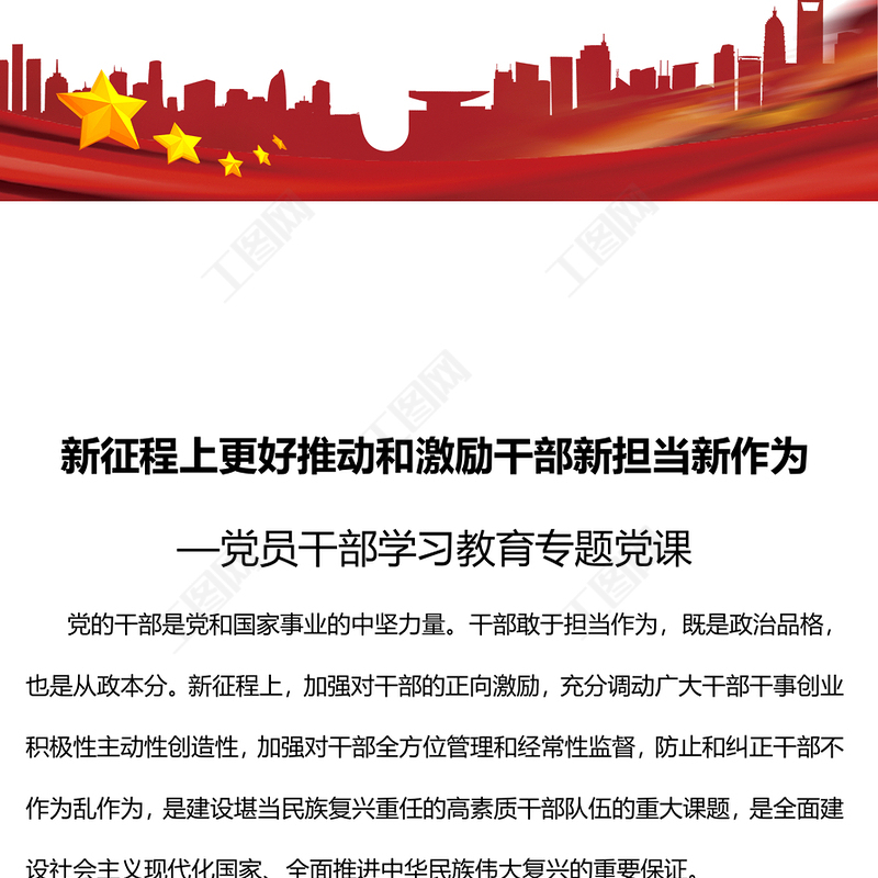 工圖網提供2023新征程上更好推動和激勵干部新?lián)斝伦鳛镻PT大氣精美風黨員干部學習教育專題黨課課件(講稿)供會員免費下載。更多精彩黨課PPT素材,盡在工圖網。
