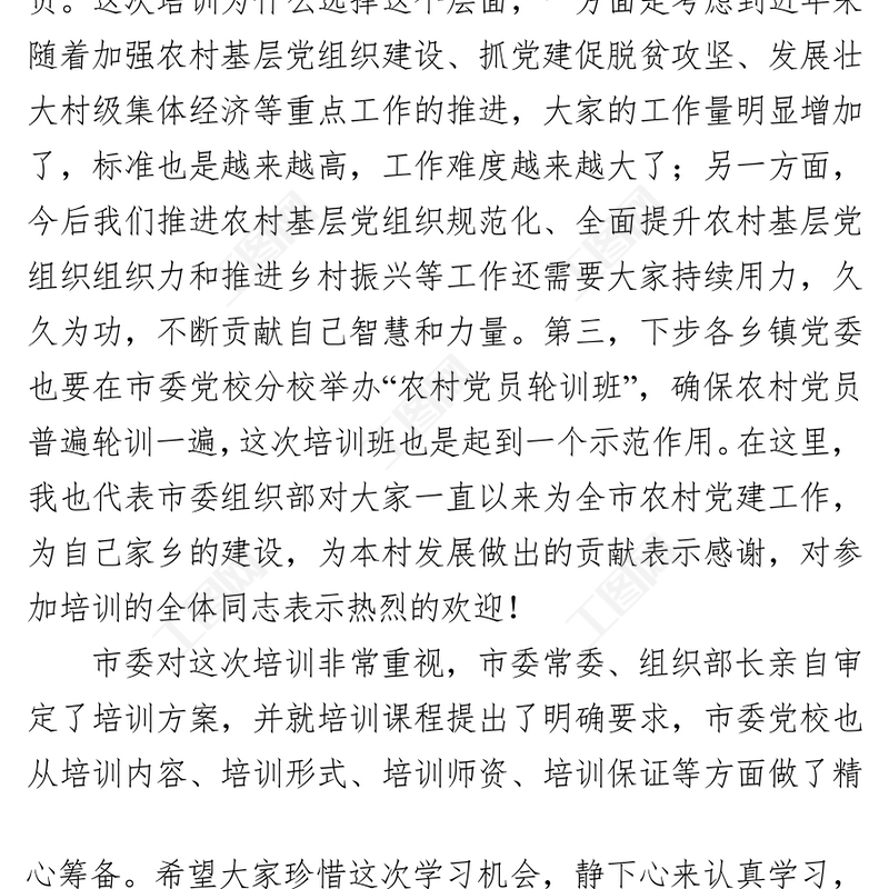 工圖網(wǎng)提供在農(nóng)村黨員培訓班上的講話的公文素材供會員免費下載。更多精彩黨課PPT素材,盡在工圖網(wǎng)。