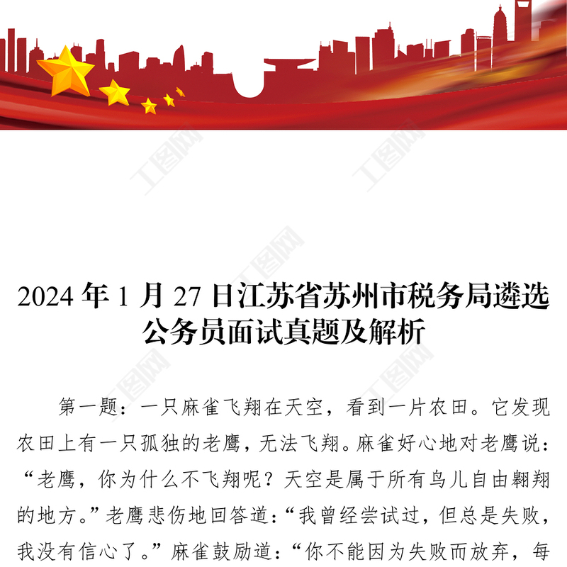 工圖網(wǎng)提供2024年1月27日江蘇省蘇州市稅務(wù)局遴選公務(wù)員面試真題及解析供會(huì)員免費(fèi)下載。更多精彩黨課PPT素材,盡在工圖網(wǎng)。